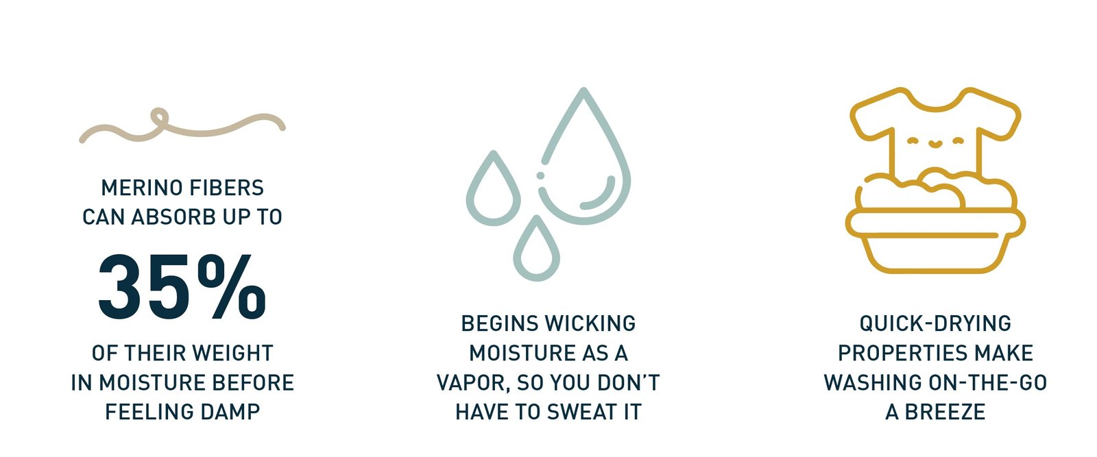 Merino fibers can absorb up to 35 percent of their weight in moisture before you start to feel that dampness against your skin. The construction of merino fibers, and the way we create our garments, enables moisture to evaporate efficiently, allowing your layers to dry incredibly quickly when you’re sweating from a long run or lounging in the sun after taking a fully-clothed dunk in a lake. Just (gently) squeeze out the excess water or hike it dry.